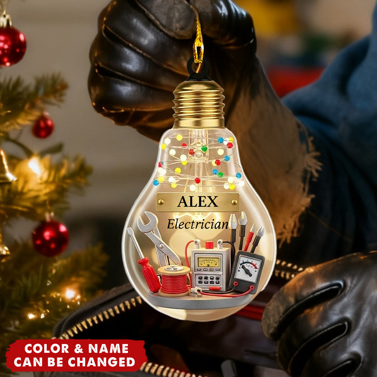 Personalized Light Bulb Ornament, Custom Name Electrician Christmas Gift, Tools Decor, Xmas Keepsake for Electrician